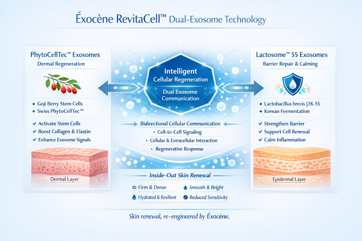 At the core of Éxocène Sérum RevitaCell lies a dual-exosome system engineered for intelligent skin regeneration, reflecting Éxocène’s commitment to advanced cellular skincare.